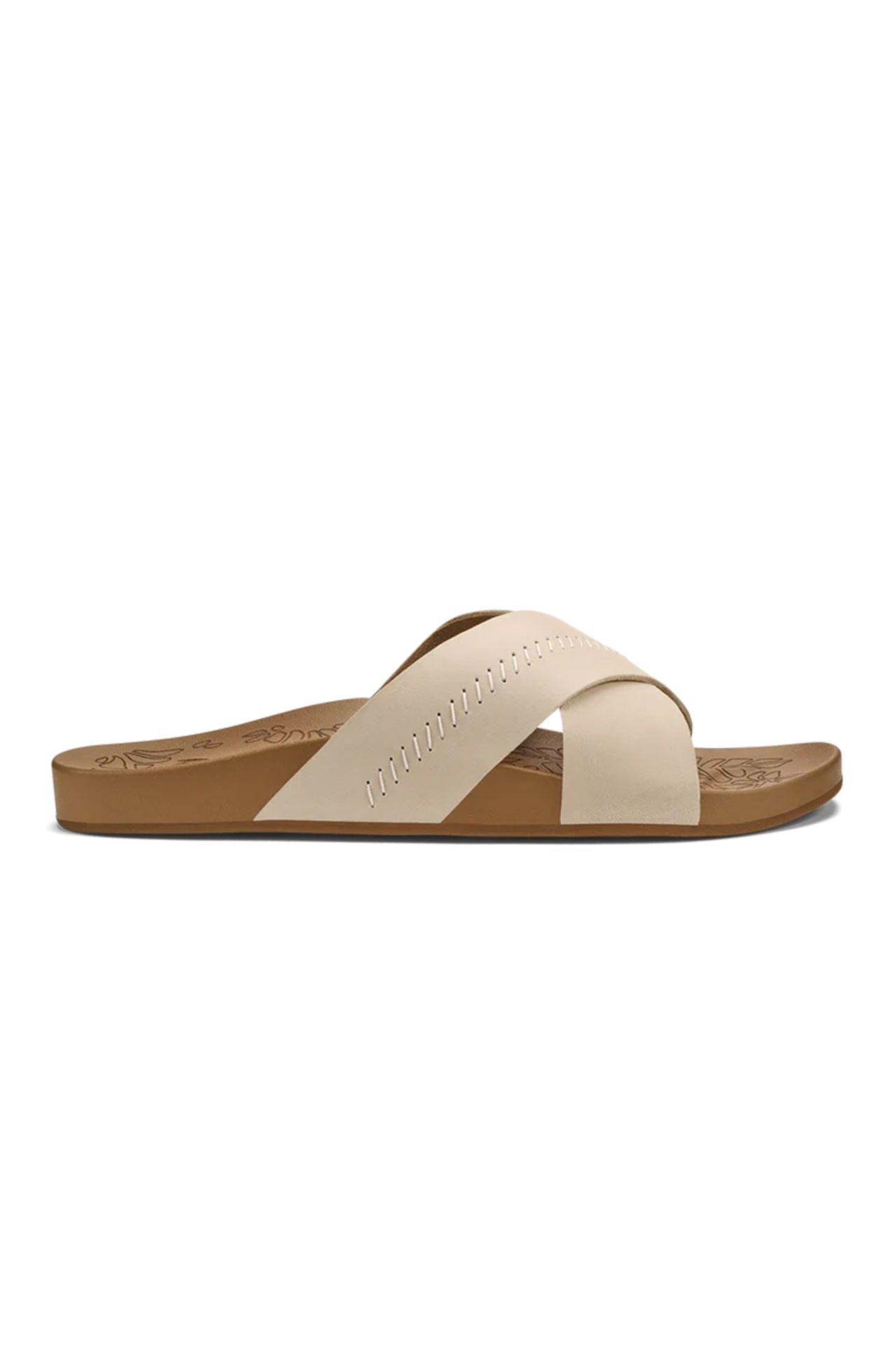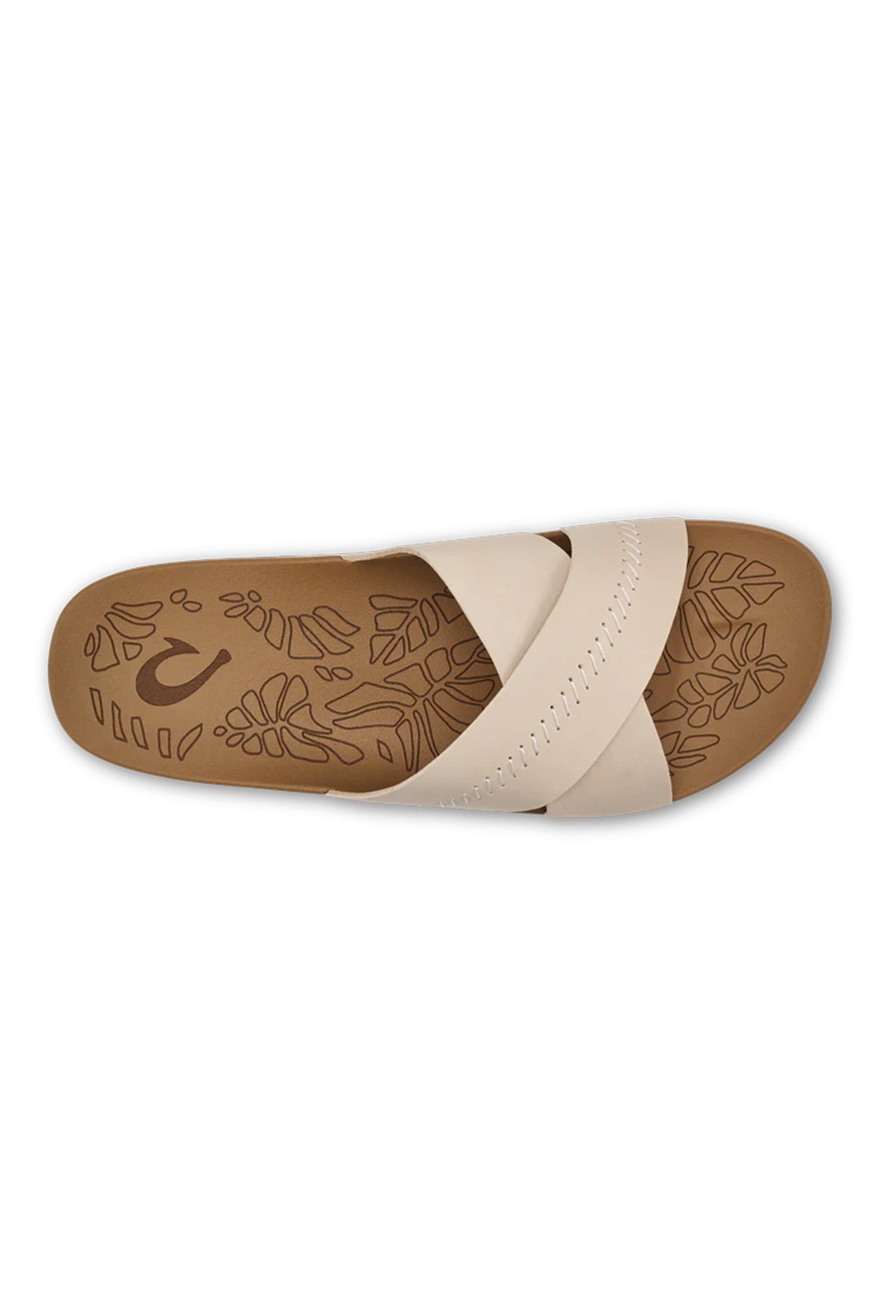 OluKai Craftsmanship: Custom stitching and delicate floral artwork on the slide reflect meticulous attention to detail, adding a distinctive handcrafted touch.