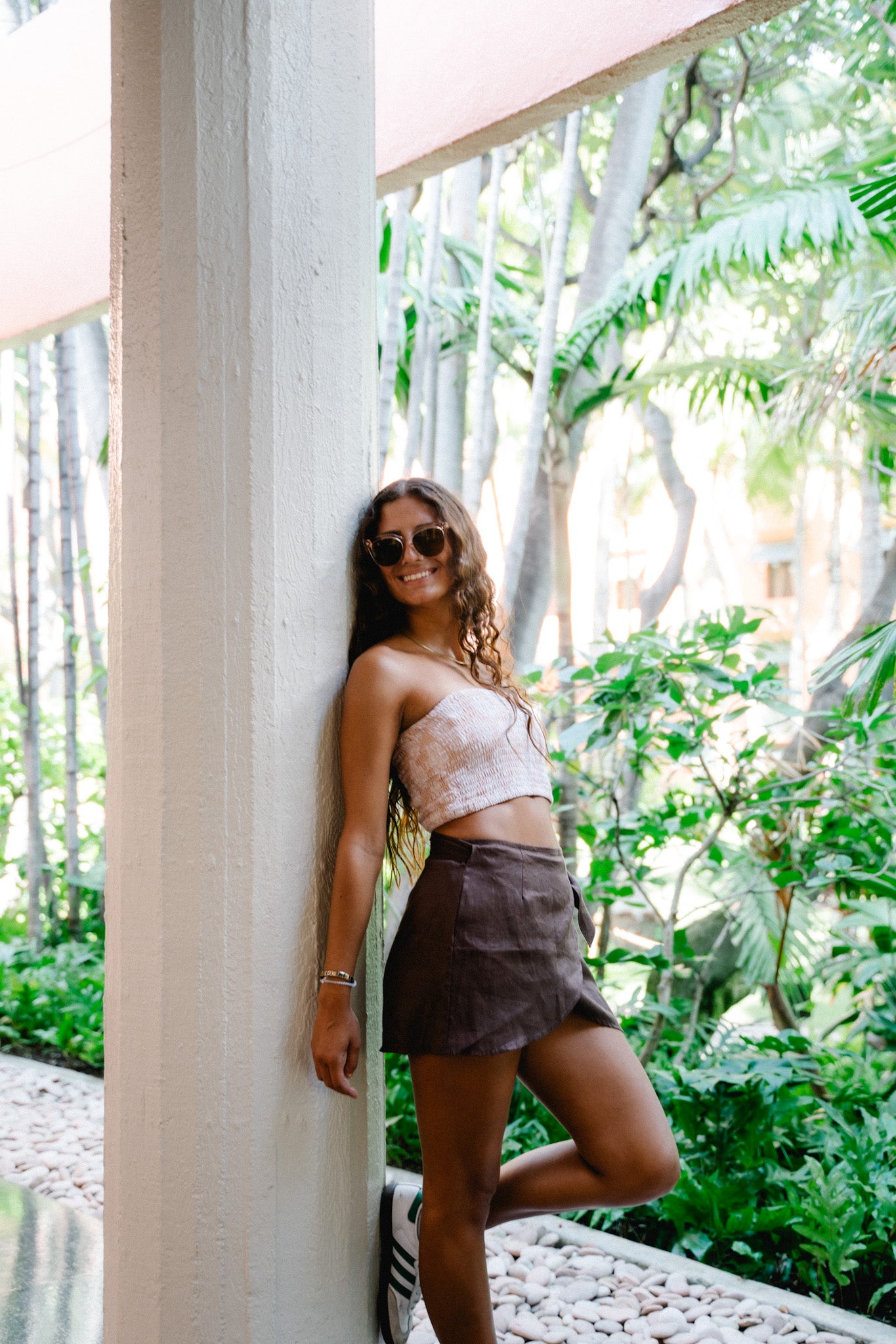 Back and in and all-new color. The Lau Lau Mini Skirt now in our new carefully curated shade of brown, is a wrap-around mini with an adjustable tie-waist. Made with a premium rayon-linen blend and a hemline that falls in the middle of the thigh for a shorter, flattering silhouette.