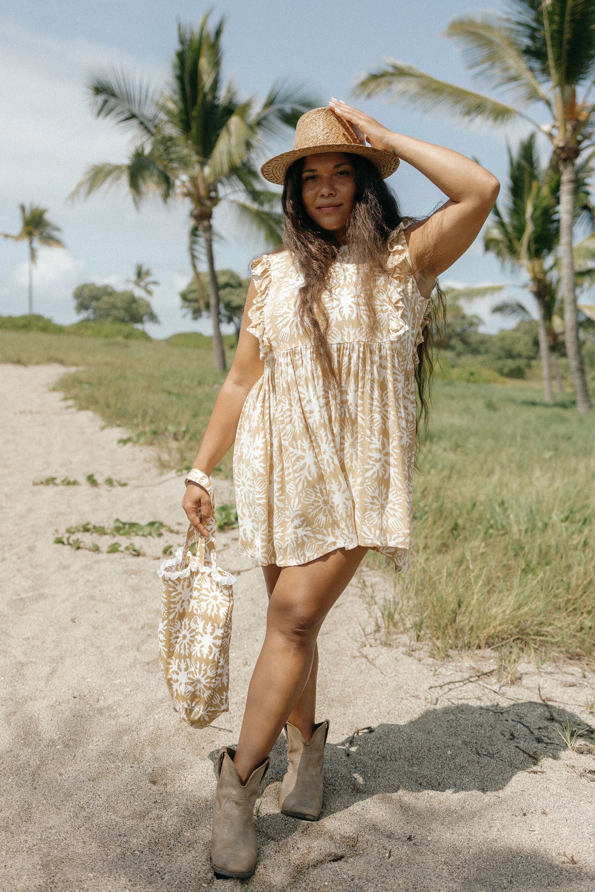 Carry your essentials island style with the Ruffle Tote from Alohiwai's Vintage Aloha collection. Crafted from 100% cotton canvas in the fresh Sugar Cane colorway, it features a nostalgic Hawaiian quilt print paired with delicate eyelet lace detailing. Perfect for school runs, office days, or beach outings.